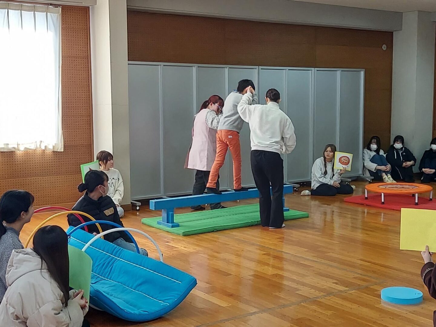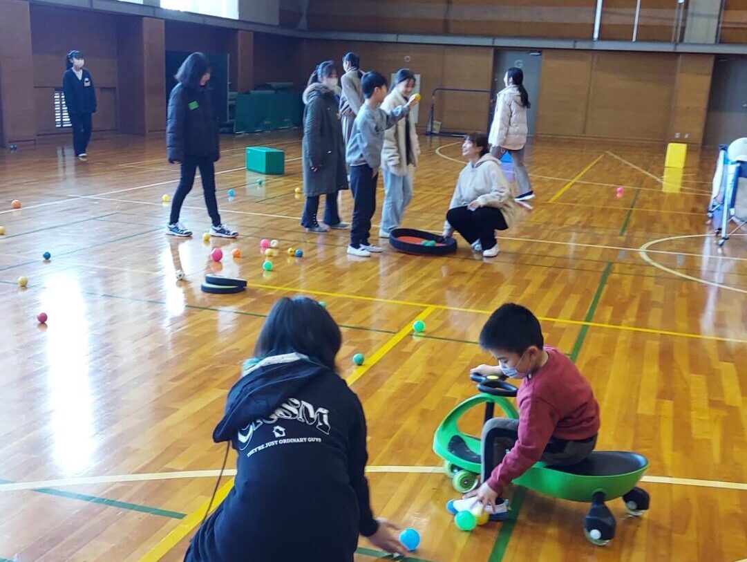 実習の最初は、まずは、体育館で体を動かし、学生と遊びます。