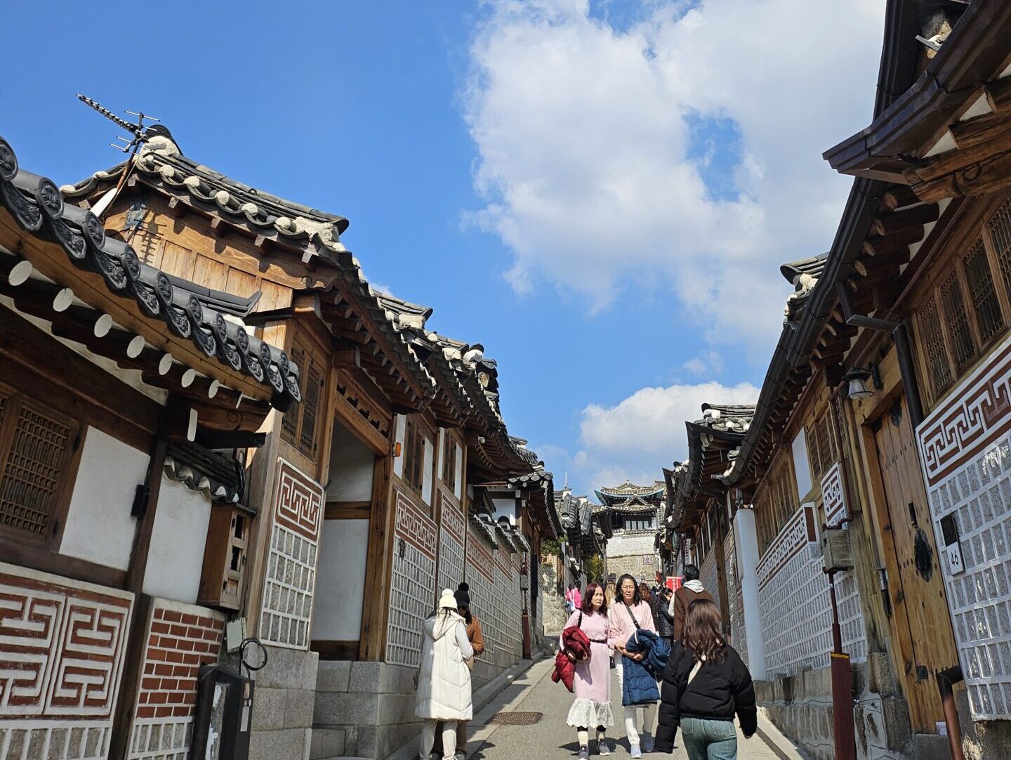 3日目と4日目の午前中は自由行動。北村韓屋村を訪れ、伝統的な街並みの中で韓国の歴史や文化を感じるひとときを過ごしました。ました。また、12階建てのダイソーでのショッピングや、人気のハート型ティラミスを味わうなど、韓国ならではの体験を楽しみました。