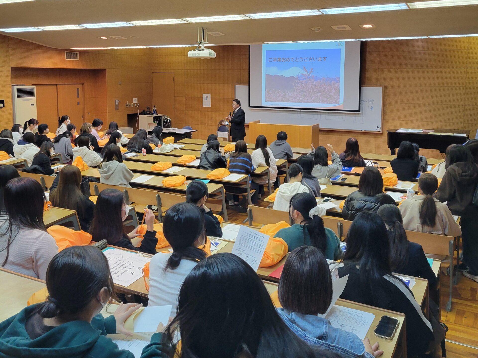 卒業式前日には、卒業オリエンテーションが開催されました。ホームカミングデーの案内や学習成果の報告、卒業生アンケートが行われ、学生たちは思い出を振り返りながら、後輩に向けたアドバイスを送りました。