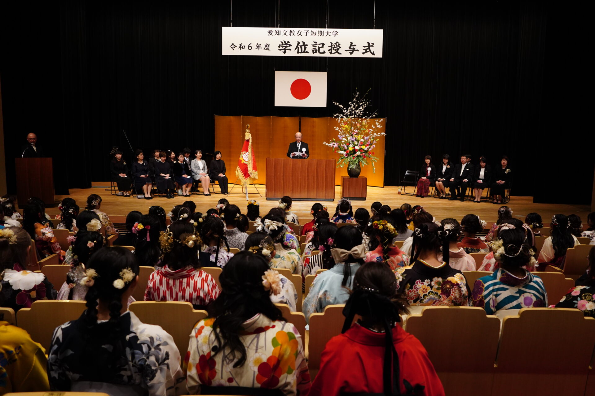 卒業式当日は、色とりどりの袴姿に身を包んだ卒業生たちが、保護者の皆様と共に式典に臨みました。学位記授与の際には、学長と共に記念写真を撮る学生も多く、和やかで温かい雰囲気の中で進行しました。