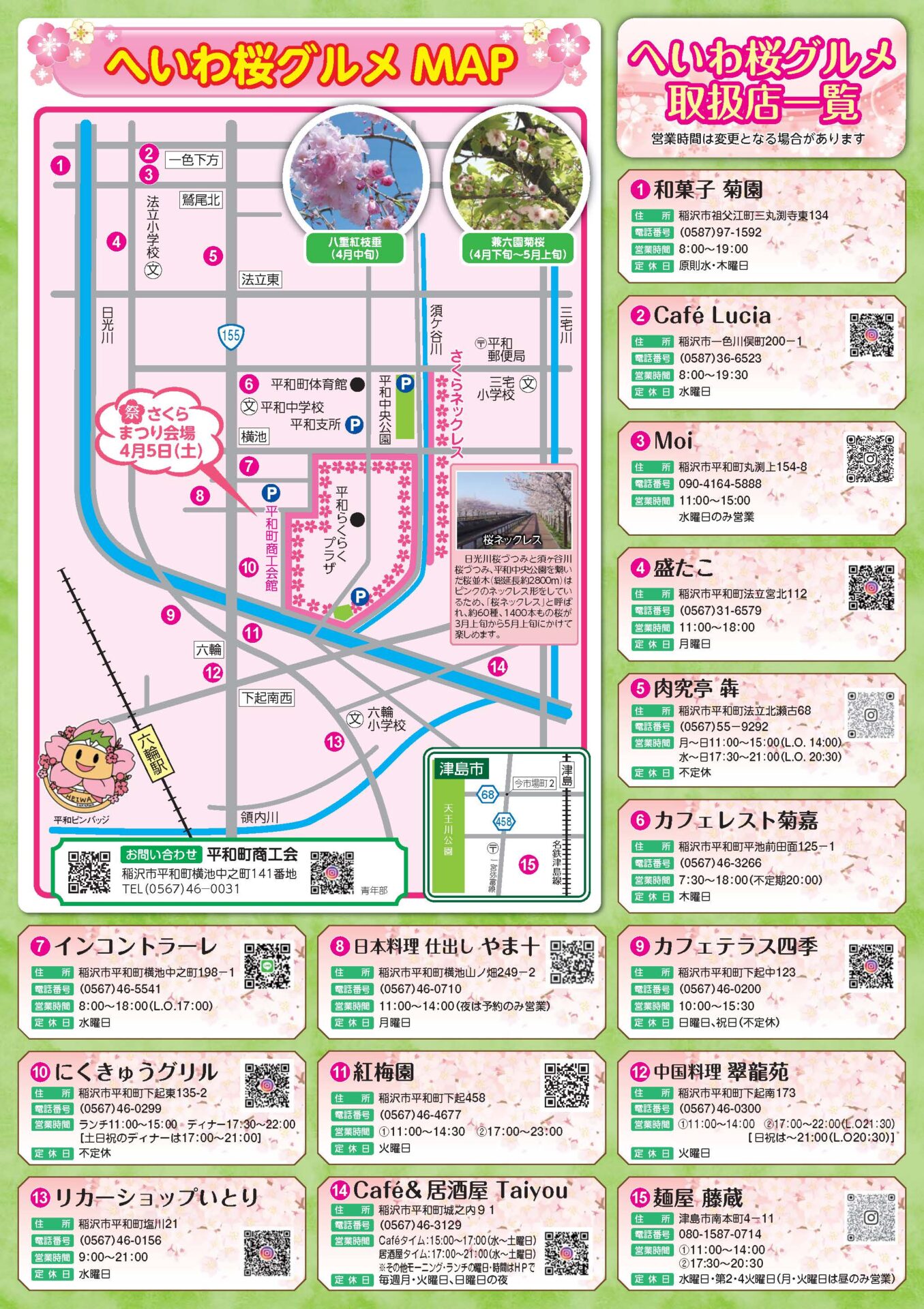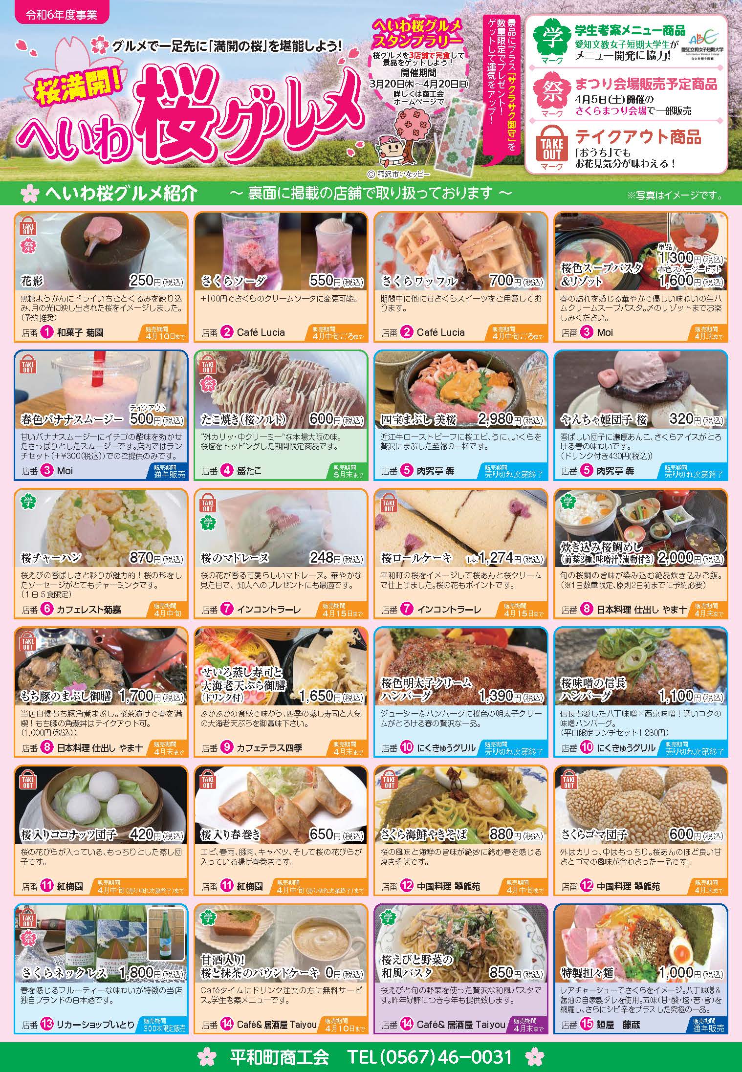 へいわ「桜グルメ」は今年で6回目の企画で、稲沢市平和町で開かれる「へいわさくらまつり」に合わせ、商工会所属の飲食店が限定グルメを提供。有尾先生のゼミ生とのコラボ商品も毎年行っており、今年は、5品が商品化されました。チラシの緑色の桜マーク(学の白抜き)の料理です。お近くにお寄りの際はぜ召し上がってください。