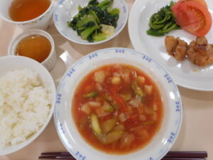 A献立は、鶏の照り焼き、チンゲン菜のピーナッツ和え、ミネストローネ、きな粉プリン。