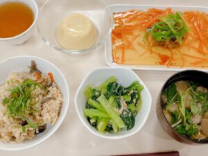 B献立は具沢山炊き込みご飯、しいたけのすまし汁、かれいの和風あんかけ、小松菜のくるみ和え、豆乳プリン。