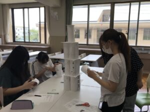 チームビルディング(ペーパータワー) 2022.06.13 本日、生活文化専攻2年生 グループワークを行いました。 チームビルディング(ペーパータワー)です。 制限時間内にグループでタワーを積み上げます。 用紙は折ったり、切ったりしても構いません。 2回戦行い、より高く積み上げられたグループが優勝です。 グループで力を合わせて取り組みました。