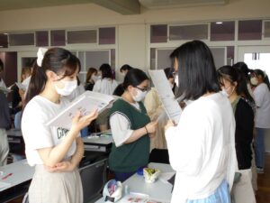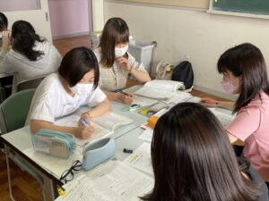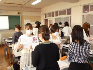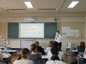 保育の英会話 2022.06.21 この授業では、保育の現場で役立つ英語表現を出来るだけ多く身につけることを目指しています。 今回は、新しく保育園に入園する保護者に、登園時間や持ち物を説明する、という会話です。 ネイティブの発音に慣れ、授業中に学生ができるだけ英語を使う機会が持てるよう、グループワークやペアワークをたくさん取り入れています。 高校までの英語に苦手意識がある学生もいますが、この授業で英語が身近になり、積極的に授業に参加しようとする態度が育っています。